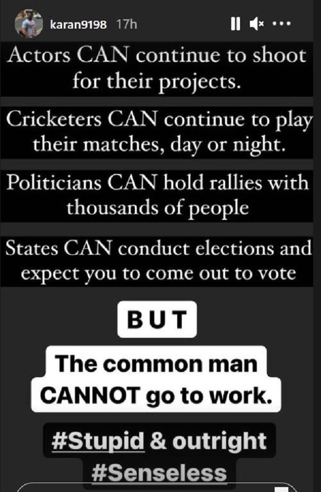 इन सभी के बीच टेलीविजन अभिनेता करण पटेल का गुस्सा फूट पड़ा हैl उन्होंने कहा कि इस बात का कोई तुक नहीं है कि आम आदमी काम पर ना जाएl करण पटेल अक्सर सोशल मीडिया पर अपनी बातें रखते हैंl अब उन्होंने कहा है कि अभिनेता, क्रिकेटर और नेता अपना काम कर सकते हैं लेकिन आम आदमी नहीं कर सकता और सबसे ज्यादा मार उसी को झेलनी हैl उन्होंने पोस्ट शेयर कर लिखा, 'अभिनेता अपने प्रोजेक्ट की शूटिंग कर सकते हैंl क्रिकेटर अपने मैच खेल सकते हैंl नेता हजारों लोगों के बीच में रैली कर सकते हैंl राज्य चुनाव करा सकता हैl लोगों से वोट डालने की अपील करता है लेकिन आम आदमी काम पर नहीं जा सकताl यह बहुत ही बेवकूफाना हैl'