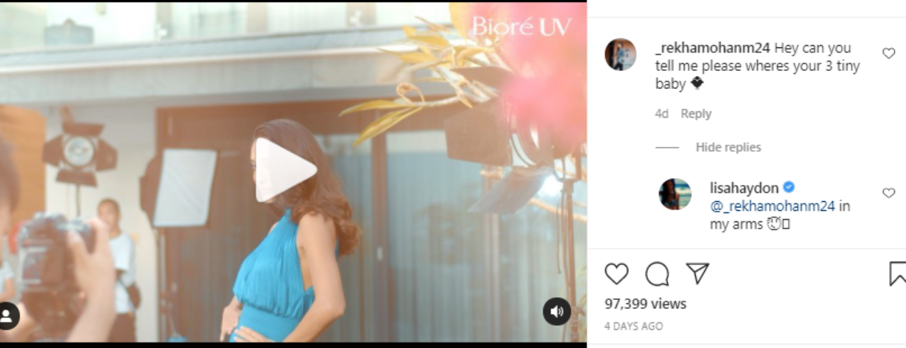 लीज़ा ने एक वीडियो पोस्ट किया था, जिस पर एक यूज़र ने उनसे पूछा- क्या आप मुझे बता सकती हैं कि आपका तीसरा छोटा सा बच्चा कहा हैं? इस पर लीज़ा ने लिखा- मेरी बाहों में। बता दें, लीज़ा ने बच्चे के जेंडर का खुलासा पहले ही कर दिया था।